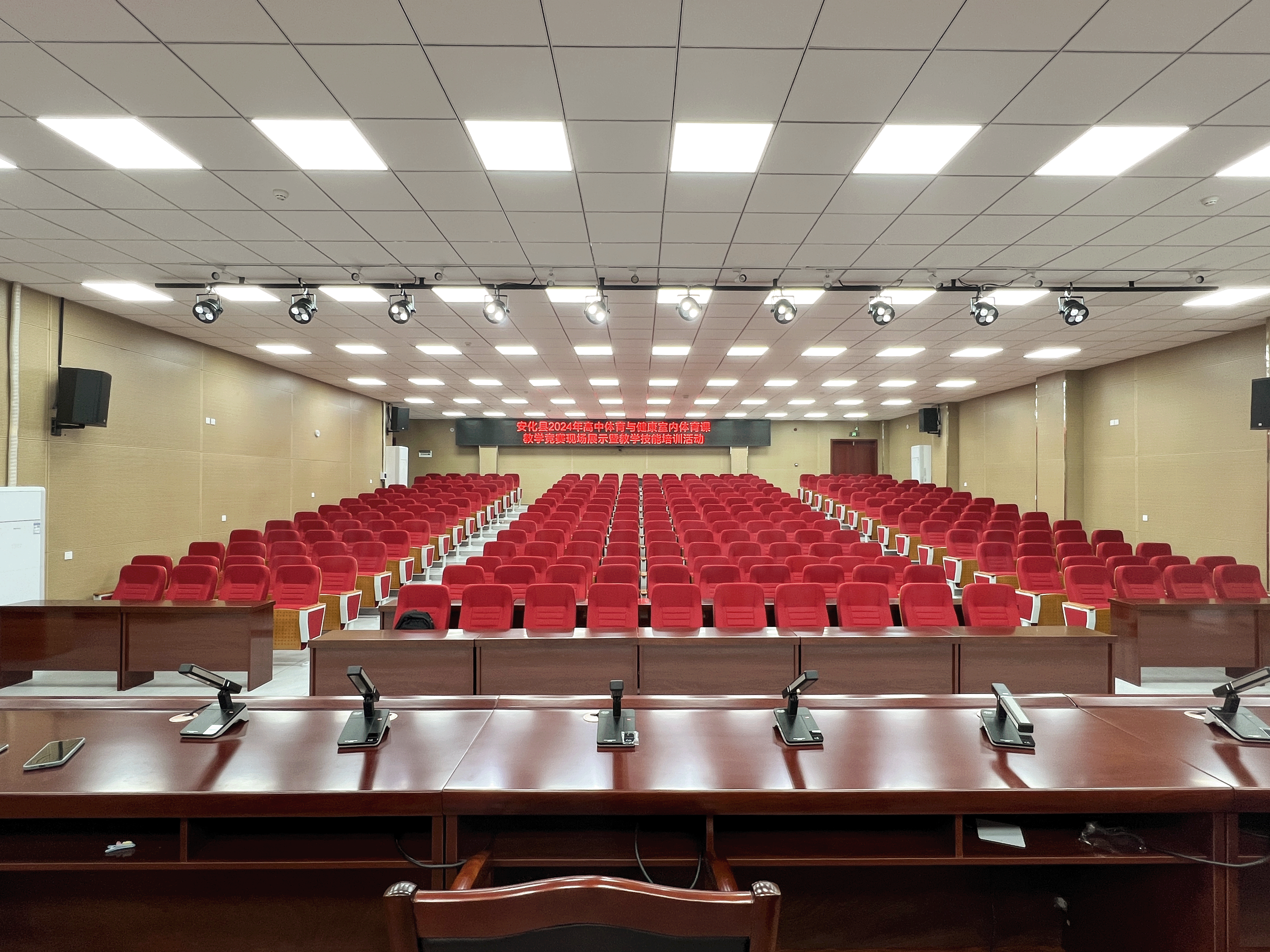 报告厅灯光布局注重层次与照度控制,面光、顶光与侧光相互配合,可灵活适应会议、演讲及演出等多种场景。灯光色温与亮度可随中控自动调节,营造舒适的视觉氛围。报告厅目前已成功承办多场专家讲座与学术交流活动,现场声画同步、操控便捷,获得使用方的高度评价。